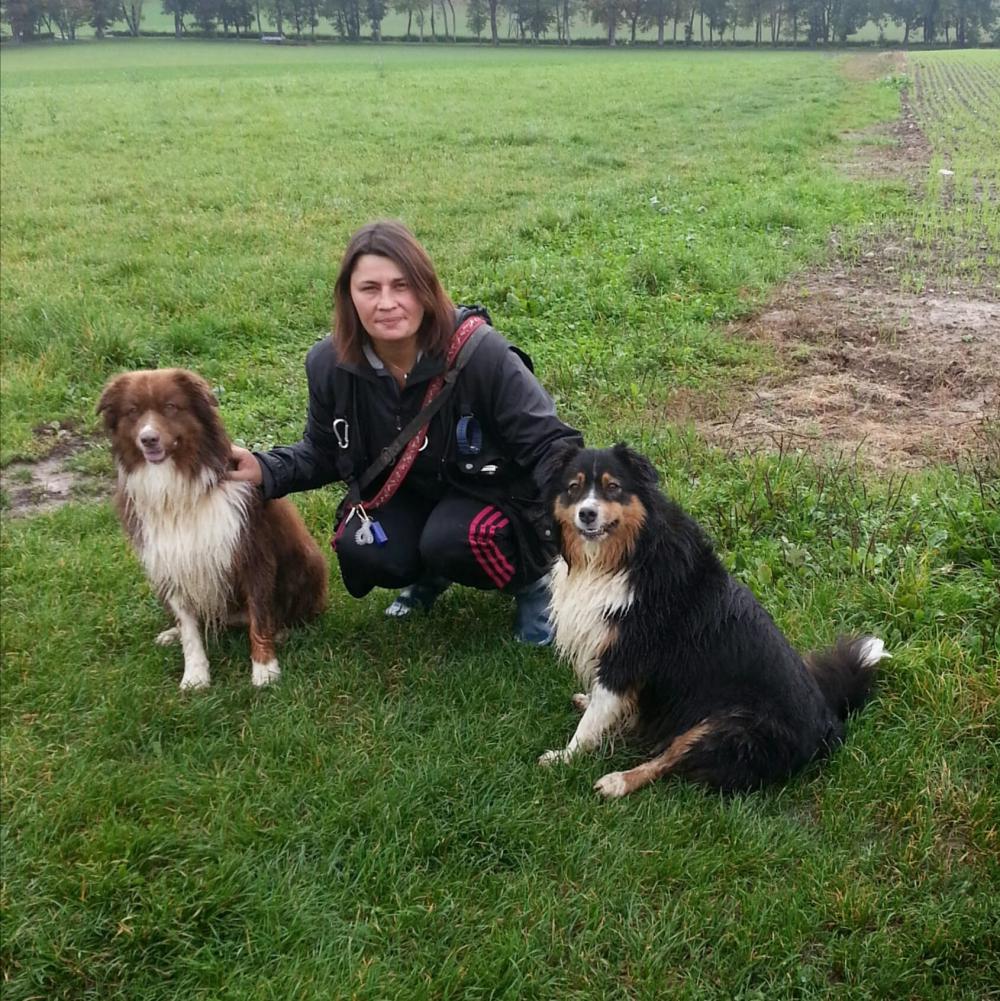 Actuellement, elle a 3 chiens (un croisé beauceron et deux bergers australien).